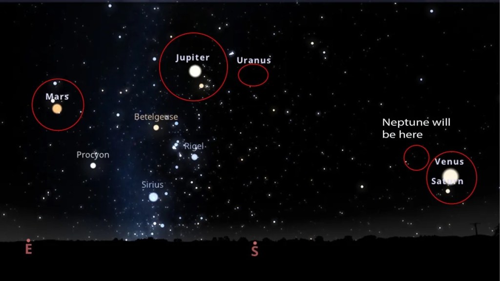 There will be six planets visible this time around, including Venus, Mars, Jupiter, Saturn, Neptune and Uranus. The six planets will be visible in the days leading up to Jan. 21, 2025, and for about four weeks afterward. Mars, Venus, Jupiter and Saturn should be visible to the naked eye.